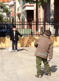 头先系出面,睇到呢两个豆丁打羽毛球真系好搞笑,全程都响度开球、执球无一个接得中,哈哈!